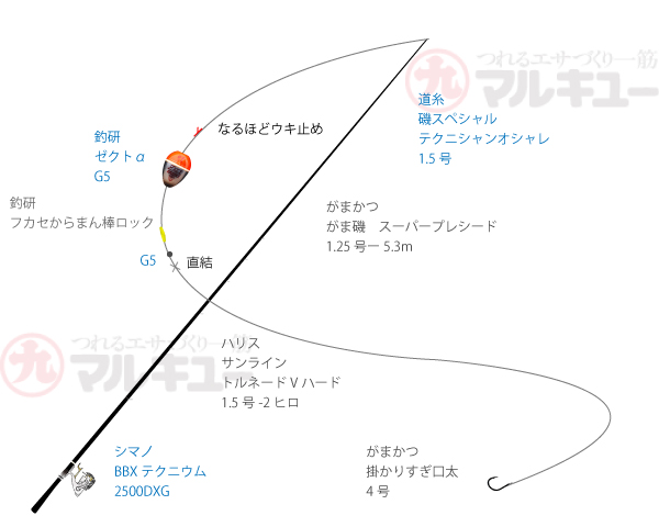 竿:がま磯 /スーパープレシード 1.25号-50、リール:シマノ/BB-X テクニウム2500DXG、道糸:サンライン/テクニシャンオシャレ 1.5号、ハリス:サンライン/トルネードVハード 1.5号、ウキ:釣研/ゼクトα G5、ハリ:がまかつ /掛かりすぎ口太 4号