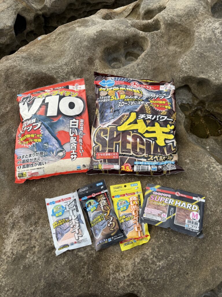 今回のマキエは「チヌパワームギスペシャル」、「グレパワーV10」にオキアミ2角。