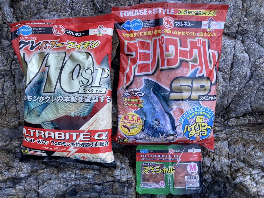 「チヌパワースペシャルMP」(1袋)+「チヌパワームギスペシャル」(1袋)+オキアミ 6kg(2角)+海水