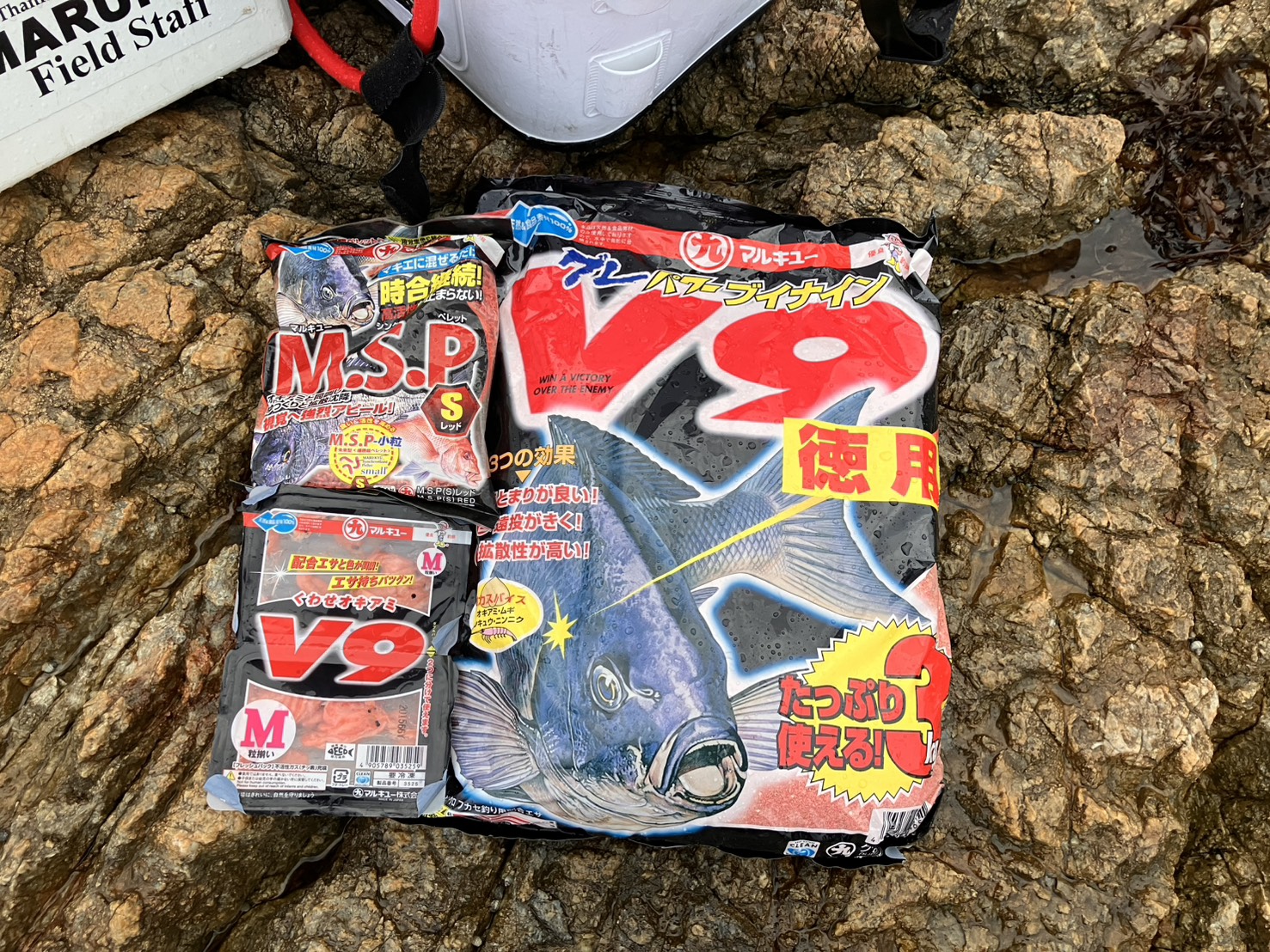 「グレパワーV9徳用」(2袋)+「M.S.P(S)レッド」(1袋)+オキアミ 6kg(2角)+海水