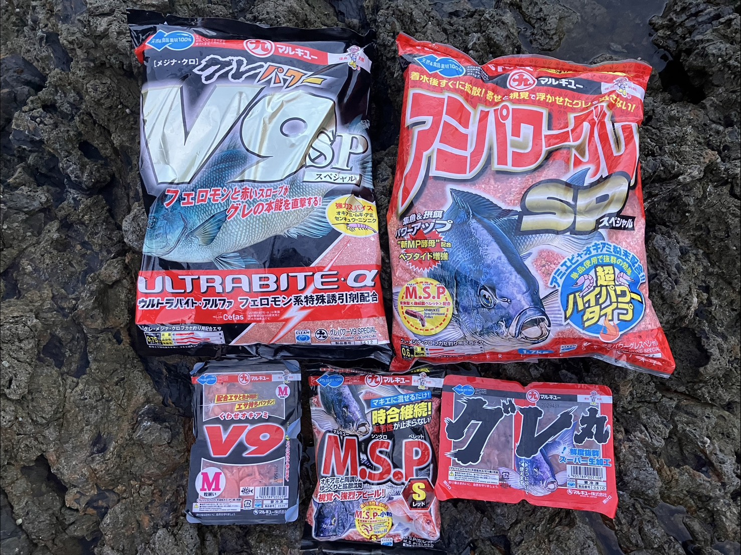 「グレパワーV9スペシャル」(1袋)+「アミパワーグレスペシャル」(1袋)+「M.S.P(S)レッド」(1袋)+オキアミ 6kg(2角)+海水