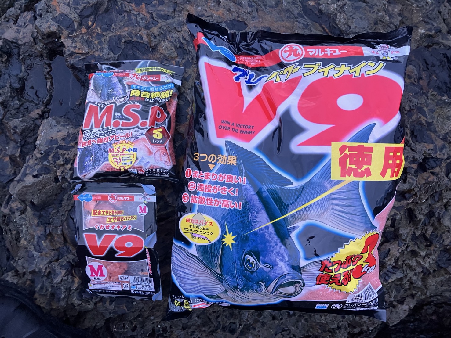 「グレパワーV9徳用」(1袋)+「M.S.P(S)レッド」(1袋)+オキアミ 6kg(2角)+海水