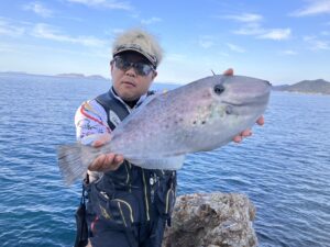 神田くんの釣果を目の当たりにして流石に焦る我々は表のポイントを諦めて裏に移動すると、ようやくグレの顔を見る事ができ一安心。