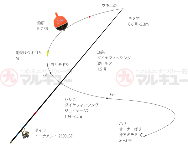 竿/チヌ竿 0号-5.3m、リール/トーナメント競技2500LBD(ダイワ)、道糸/波止チヌ 1.5号(ダイヤフィッシング)、ハリス/ジョイナーV2 1号(ダイヤフィッシング)、ウキ/K-7 3B(釣研)、ハリ/沖アミチヌ 2〜3号(オーナーばり)