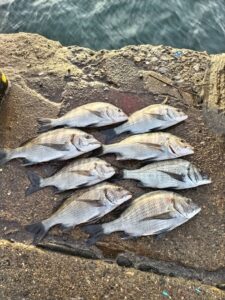 練りエサやムキ身、コーンなどいろいろ試してみるも、チヌのアタリはなく時折フグやアジがハリ掛かり。