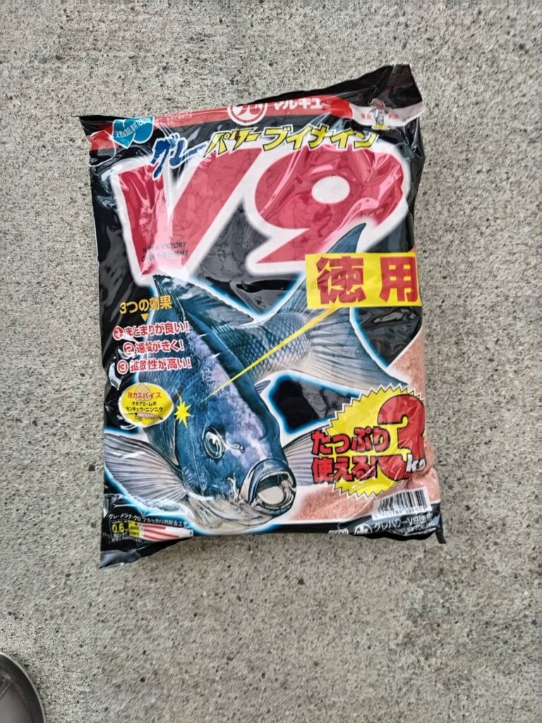 「グレパワーV9」(1袋)+「湾チヌスペシャルⅡ」(1袋)+「ムギコーンスペシャル」(1袋)+「M.S.P(S)レッド」(1袋)+オキアミ (1.5kg)+海水