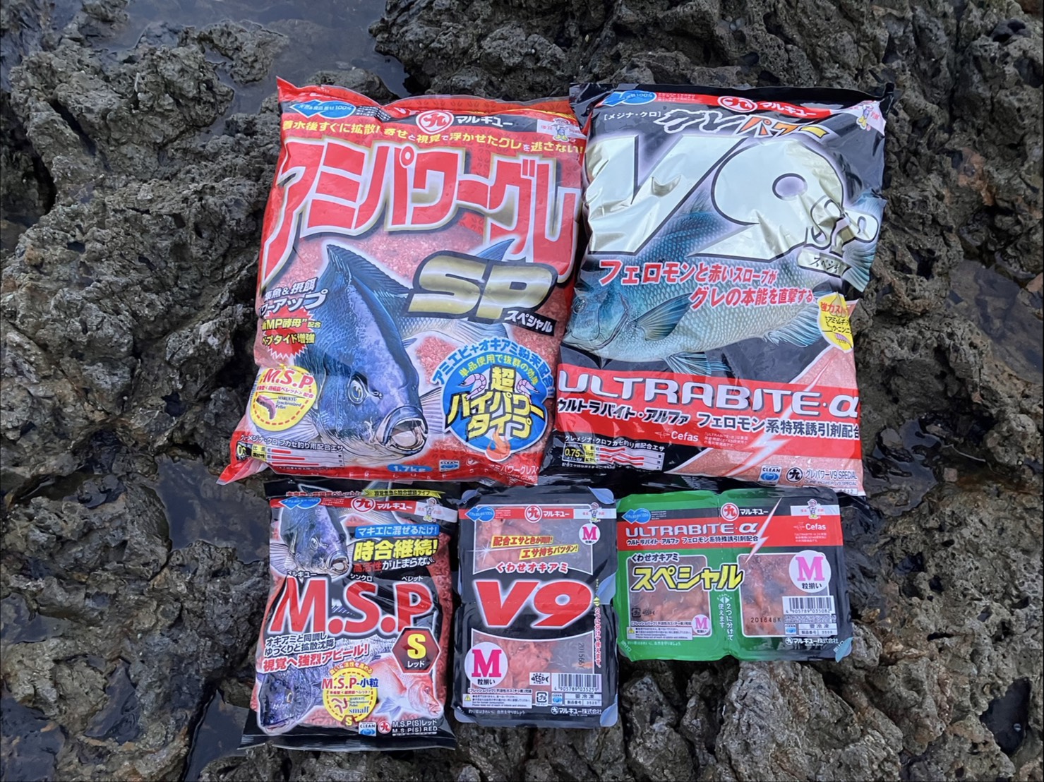 「グレパワーV9スペシャル」(1袋)+「アミパワーグレスペシャル」(1袋)+「M.S.P(S)レッド」(1袋)+オキアミ 6kg(2角)+海水