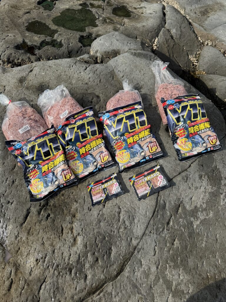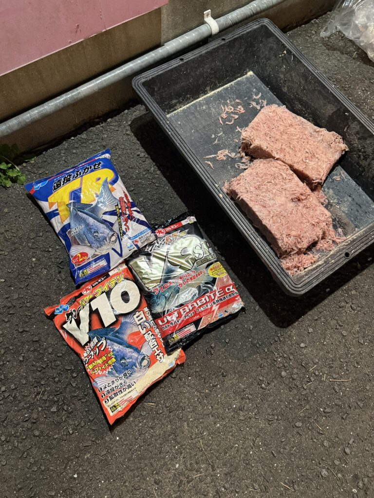 「グレパワーV10」(1袋)+「グレパワーV9スペシャル」(1袋)+「遠投ふかせTR」(1袋)+オキアミ 9kg+海水 適量