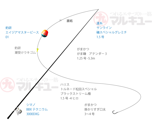 竿:がま磯 /アテンダー3 1.25号-53、リール:シマノ/BB-X テクニウム3000DXG、道糸:サンライン/磯スペシャルグレミチ 1.5号、ハリス:サンライン/ブラックストリーム極 1.5号、ウキ:釣研/エイジアマスターピース 01、ハリ:がまかつ /掛かりすぎ口太 3〜4号