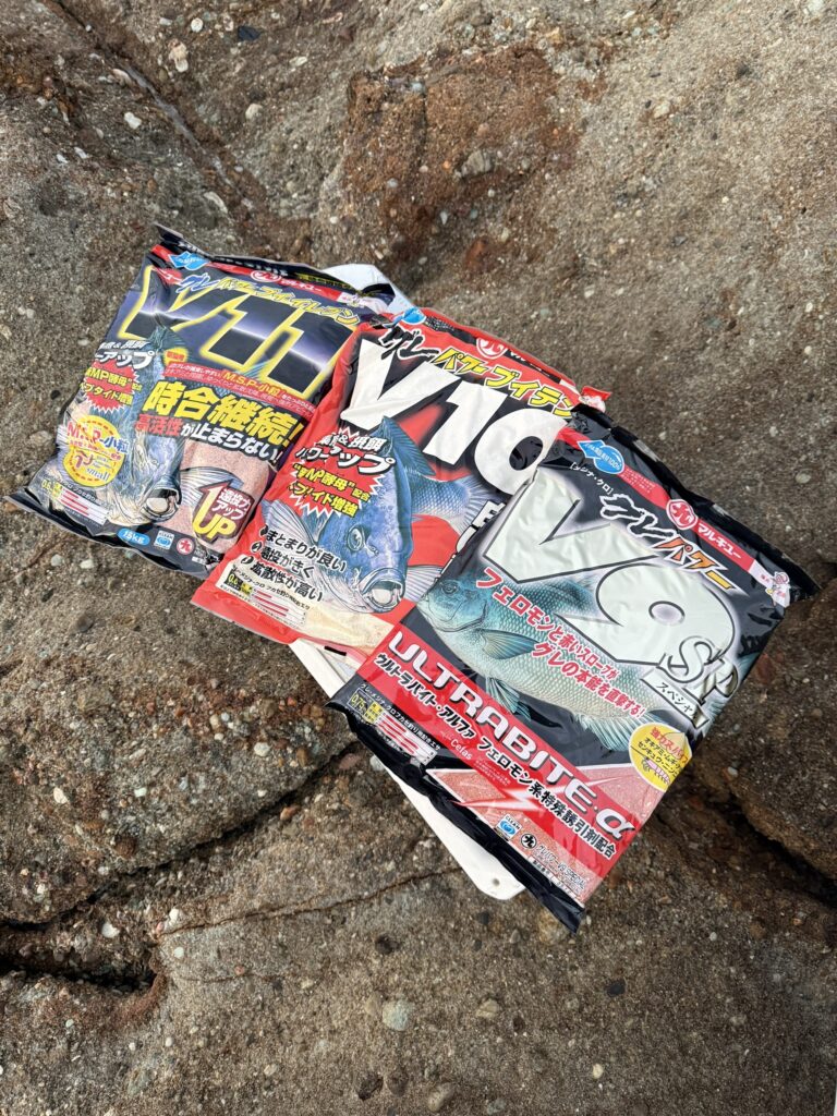 「グレパワーV10」(1袋)+「グレパワーV9スペシャル」(1袋)+「グレパワーV10」(1袋)+「M.S.P(S)レッド」(1袋)+オキアミ 9kg+海水 適量