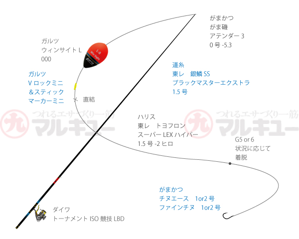 竿/がま磯 アテンダーⅢ 0号-53(がまかつ)、リール/トーナメントISO競技LBD(ダイワ)、道糸/銀鱗SSブラックマスターMK-1/ 1.5号(東レ)、ハリス/トヨフロンスーパーLEXハイパー/1.5号(東レ)、ウキ/ウィンサイト L 000(ガルツ)、ハリ/チヌエース 1〜2号 or ファインチヌ 1〜2号(がまかつ)