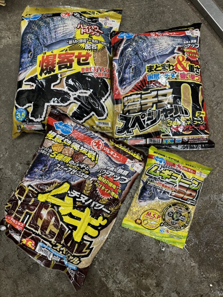 「爆寄せチヌ」(1袋)+「湾チヌスペシャルⅡ」(1袋)+「チヌパワームギスペシャル」(1袋)+オキアミ2角(6kg)+「ムギコーンスペシャル」(1袋)+海水 適量