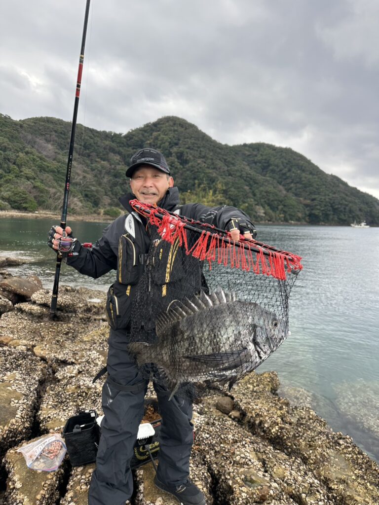 港に戻ると他のみんなもきっちりチヌを釣っていました。写真、43㎝を釣り上げた松井さん、41㎝のチヌを手に今田くん。