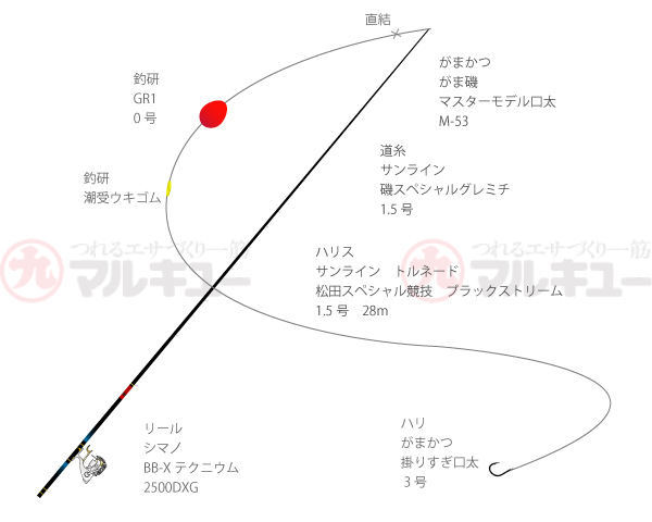 竿:がま磯 /マスターモデル口太 M-53、リール:シマノ/BBXテクニウム2500DXXG、道糸:サンライン/磯スペシャルグレミチ 1.5号、ハリス:サンライン/松田スペシャル競技ブラックストリーム/ 1.5号、ウキ:釣研/GR1 0、ハリ:がまかつ /掛りすぎ口太 3号