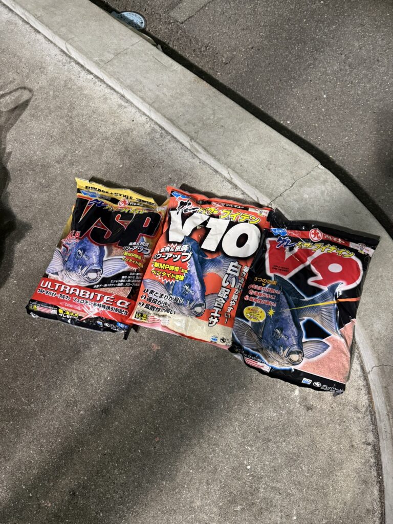 「グレパワーV10」(1袋)+「グレパワーV9」(1袋)+「グレパワーVSP」(1袋)+「M.S.P(S)レッド」(1袋)+オキアミ 9kg+海水 適量