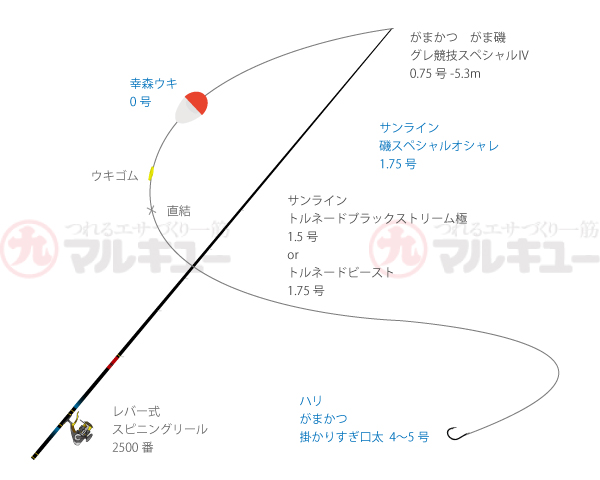 竿:がまかつ /がま磯 グレ競技スペシャル 0.75-53、リール:レバーブレーキ式スピニングリール2500番、道糸:サンライン/磯スペシャルオシャレ 1.75号、ハリス:サンライン/トルネードブラックストリーム極 1.5号 or トルネードビースト 1.5号、 ウキ:幸森ウキ/0、ハリ:がまかつ /掛かりすぎ口太 4〜5号