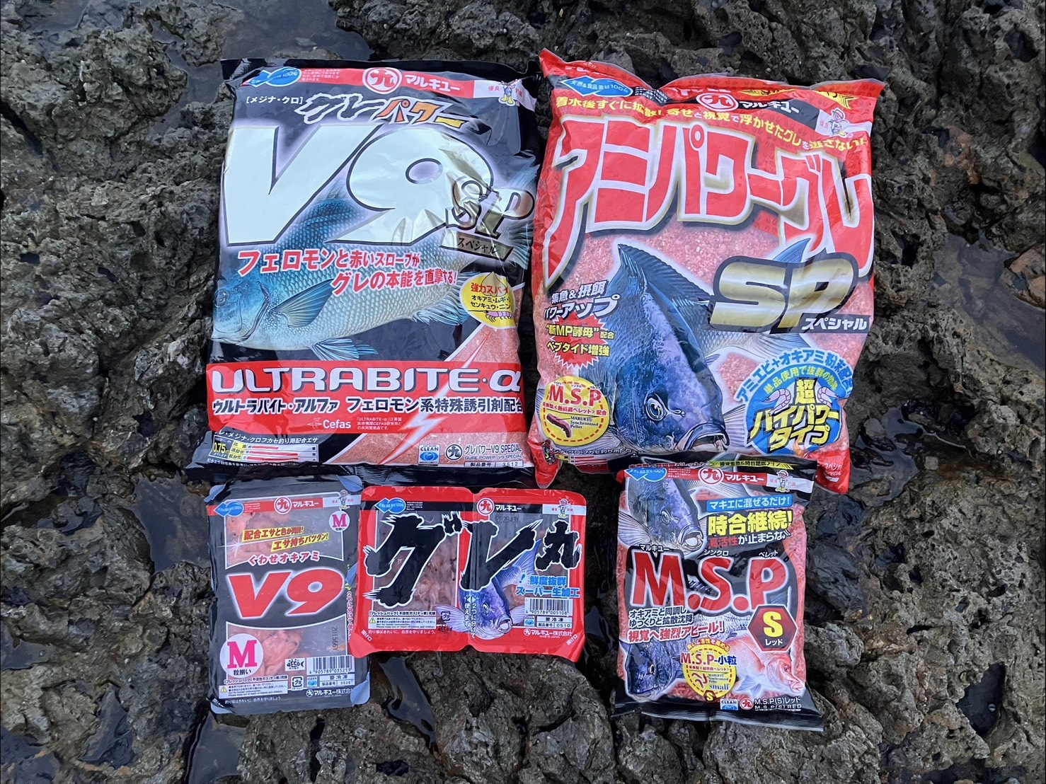 「グレパワーV9スペシャル」(1袋)+「アミパワーグレスペシャル」(1袋)+「M.S.P(S)レッド」(1袋)+オキアミ 6kg(2角)+海水