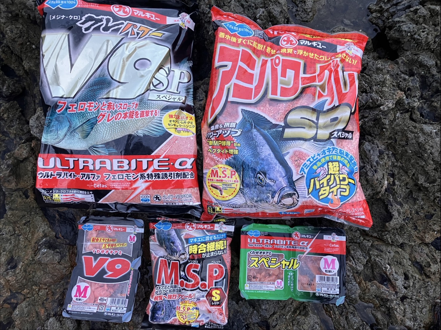 「グレパワーV9スペシャル」(2袋)+「アミパワーグレスペシャル」(1袋)+「M.S.P(S)レッド」(1袋)+オキアミ 6kg(2角)+海水