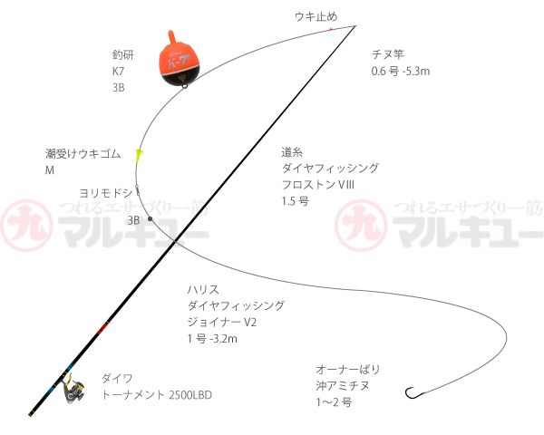 竿/チヌ竿 0.6号-5.3m、リール/トーナメント競技2500LBD(ダイワ)、道糸/フロストンV3 1.5号(ダイヤフィッシング)、ハリス/ジョイナーV2 1号(ダイヤフィッシング)、ウキ/K-7 3B(釣研)、ハリ/沖アミチヌ 1〜2号(オーナーばり)