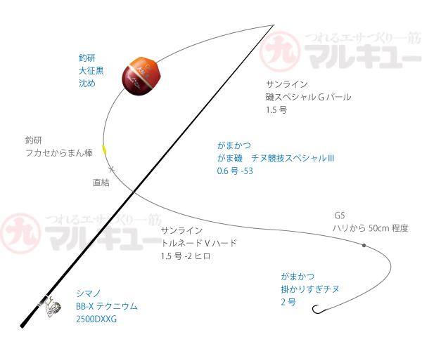 竿:がま磯 /チヌ競技スペシャル3 0.653、リール:シマノ/BB-X テクニウム2500DXG、道糸:サンライン/磯スペシャルGパール 1.5号、ハリス:サンライン/トルネード Vハード 1.5号、ウキ:釣研/大征黒 沈め、ハリ:がまかつ /掛かりすぎチヌ 2号