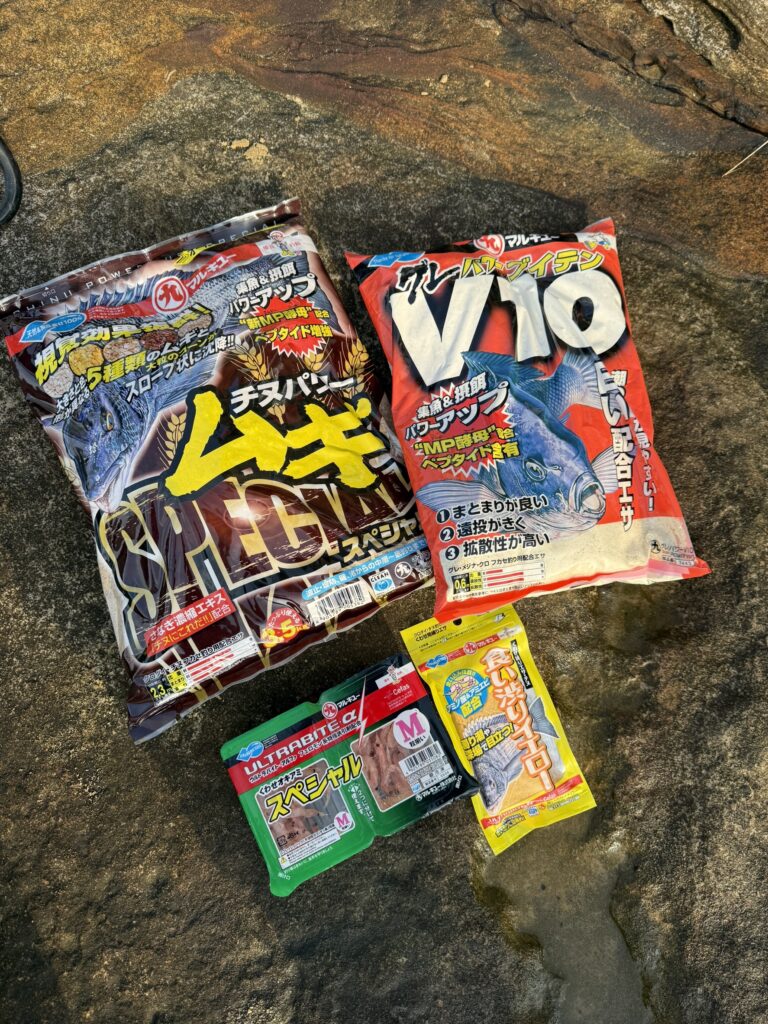マキエは「チヌパワームギスペシャル」、「グレパワーV10」各1袋にオキアミを3kg。