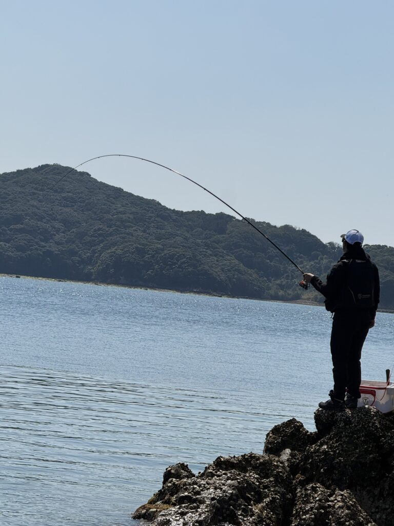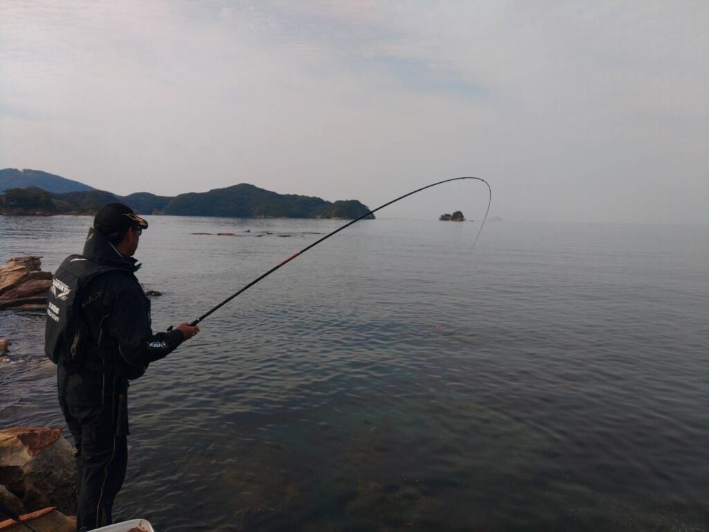 仕掛けを潮い乗せて流すと、まさかの不意打ちのアタリ!