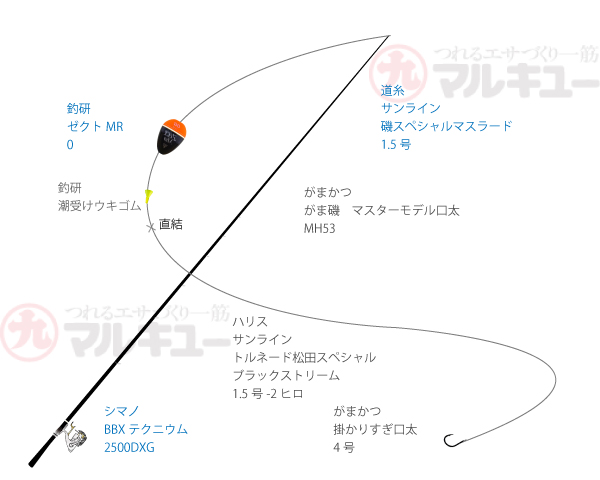 竿:がま磯 /マスターモデル口太 MH53、リール:シマノ/BB-X テクニウム2500DXG、道糸:サンライン/磯スペシャルマスラード 1.5号、ハリス:サンライン/トルネード松田スペシャルブラックストリーム 1.5号、ウキ:釣研/ゼクトMR 0、ハリ:がまかつ /掛かりすぎ口太 4号