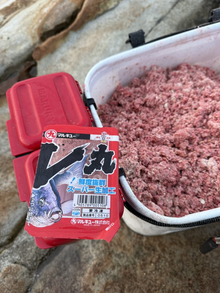 付けエサは食い渋るグレに絶大な信頼の「グレ丸」と、「くわせオキアミスペシャル」Mサイズを用意しました。