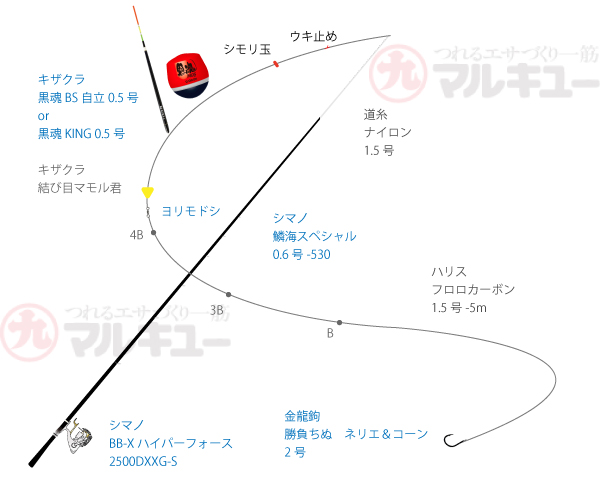竿:シマノ/鱗海スペシャル 0.6号-530、リール:シマノ/BBXハイパーフォース2500DXXG-S、道糸:ナイロン 1.5号、ハリス:フロロカーボン 1.5号、ウキ:キザクラ/黒魂BS自立 0.5号 or 黒魂キング 0.5号 、ハリ:金龍 /勝負ちぬ ネリエ&コーン 2号