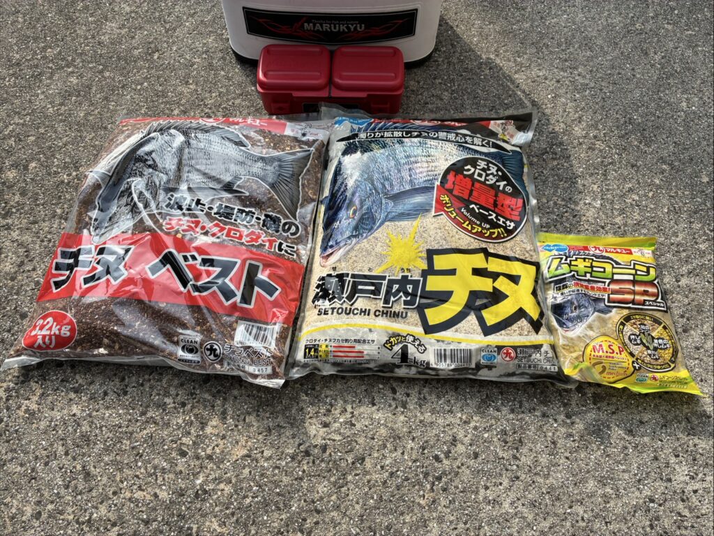 「チヌベスト」(1袋)+「瀬戸内チヌ」(1袋)+「M.S.P(S)レッド」(1袋)+海水 適量