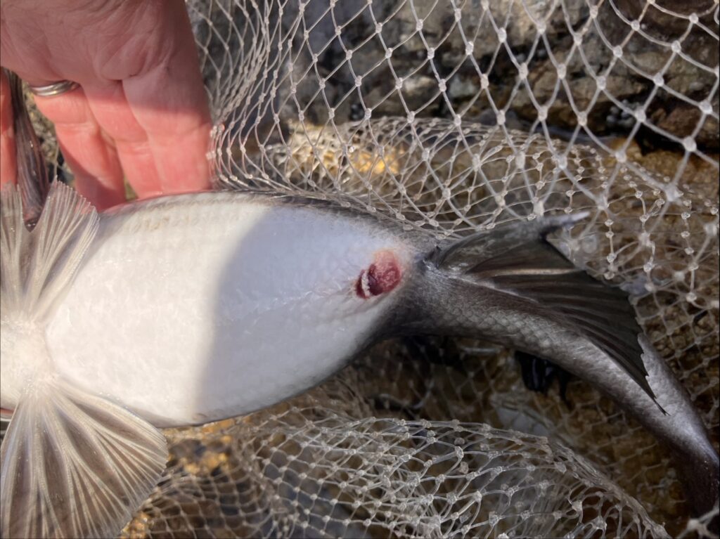 よい感じでロッドが曲がっていますが、引きがチヌらしくない…。