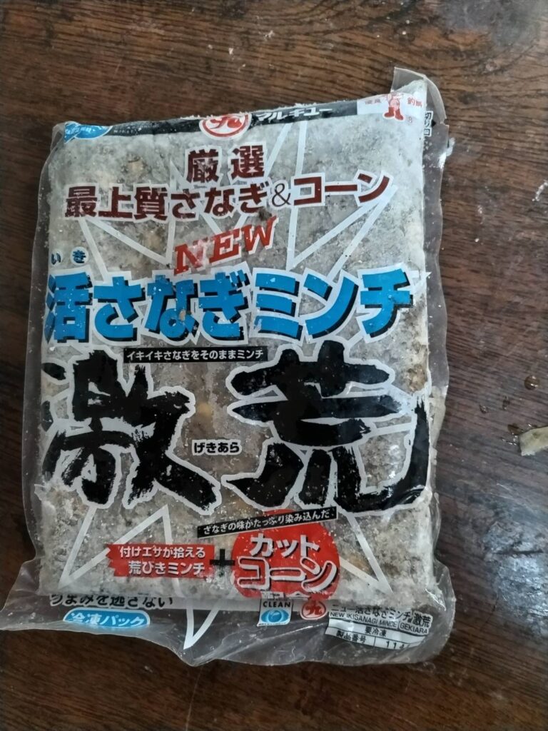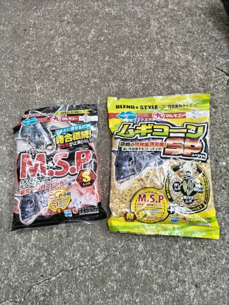「グレパワーV9徳用」(1袋)+「湾チヌスペシャルⅡ」(1袋)+「ムギコーンスペシャル」(1袋)+「M.S.P(S)レッド」(1袋)+「ニュー活さなぎミンチ激荒」(1袋)+オキアミ (1.5kg)+海水