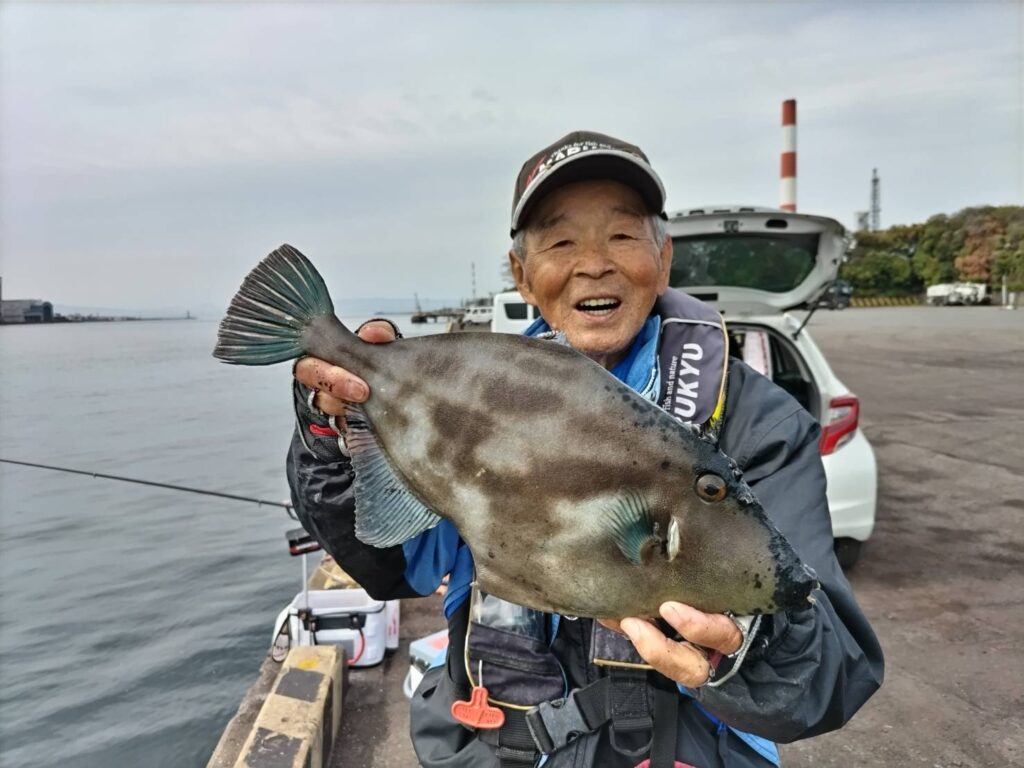 チヌではなさそうな魚ですが慎重に寄せてみると、なんと、大型のウマヅラハギでした。