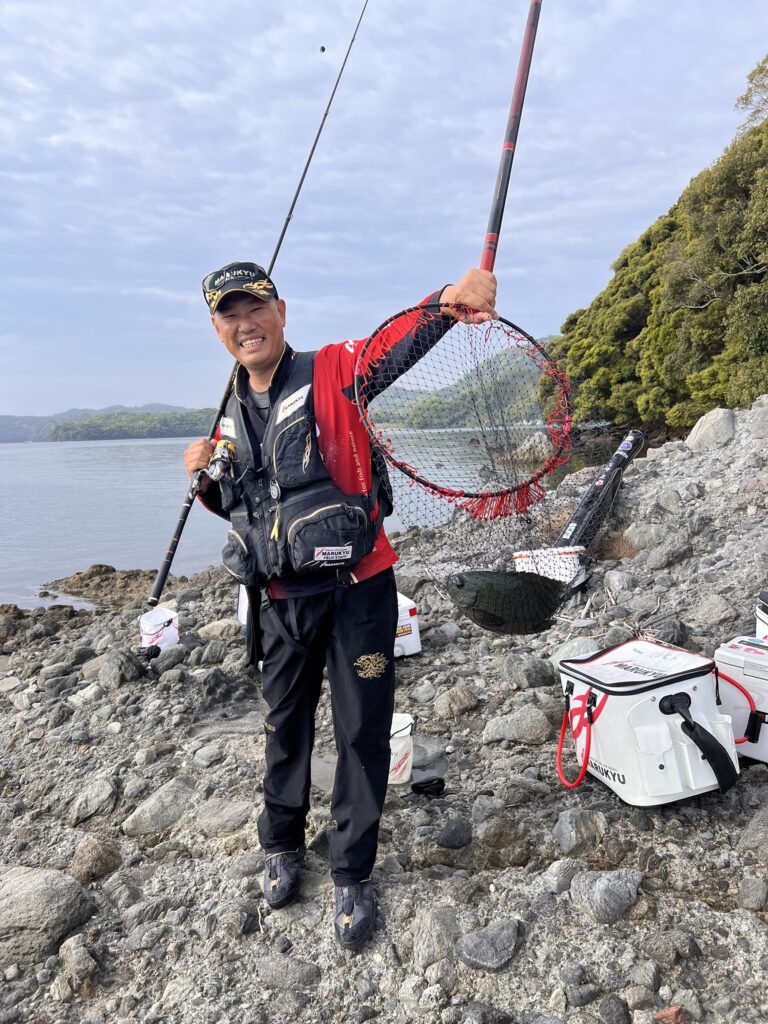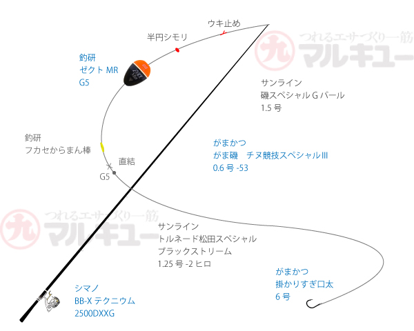竿:がま磯 /チヌ競技スペシャル3 0.653、リール:シマノ/BB-X テクニウム2500DXG、道糸:サンライン/磯スペシャルGパール 1.5号、ハリス:サンライン/トルネード松田スペシャルブラックストリーム 1.25号、ウキ:釣研/ゼクトMR G5、ハリ:がまかつ /掛かりすぎ口太 6号