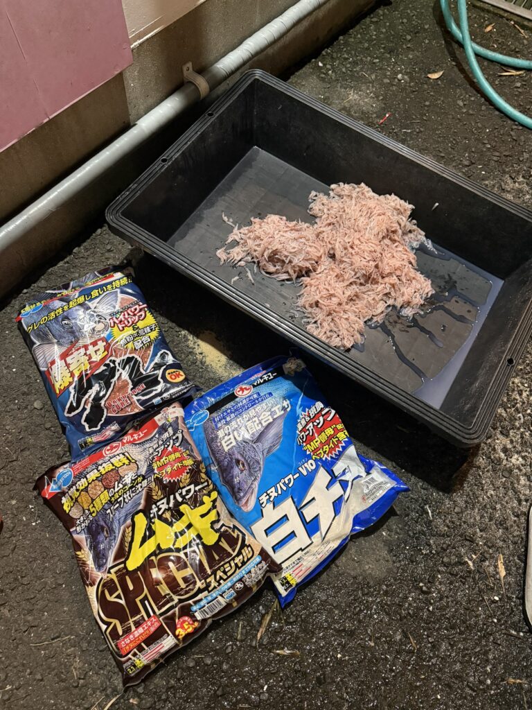 「チヌパワームギスペシャル」(1袋)+「チヌパワーV10」(1袋)+オキアミ 3kg+海水 適量