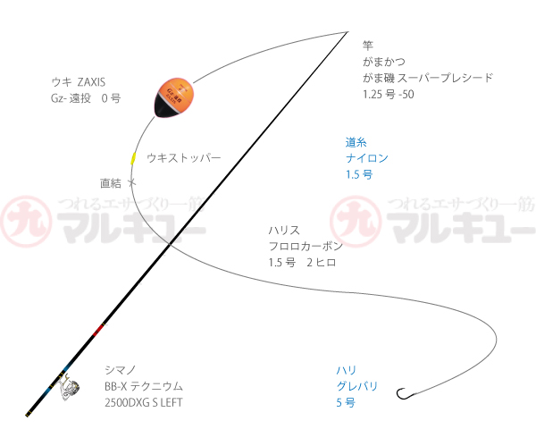 竿/がま磯スーパープレシード 1.25号-5m(がまかつ)、リール/BB-Xテクニウム2500DXG(シマノ)、道糸/ナイロン 1.5号、ハリス/フロロカーボン 1.5号、ウキ/Gz遠投 0(ザクシス)、ハリ/グレバリ 5号