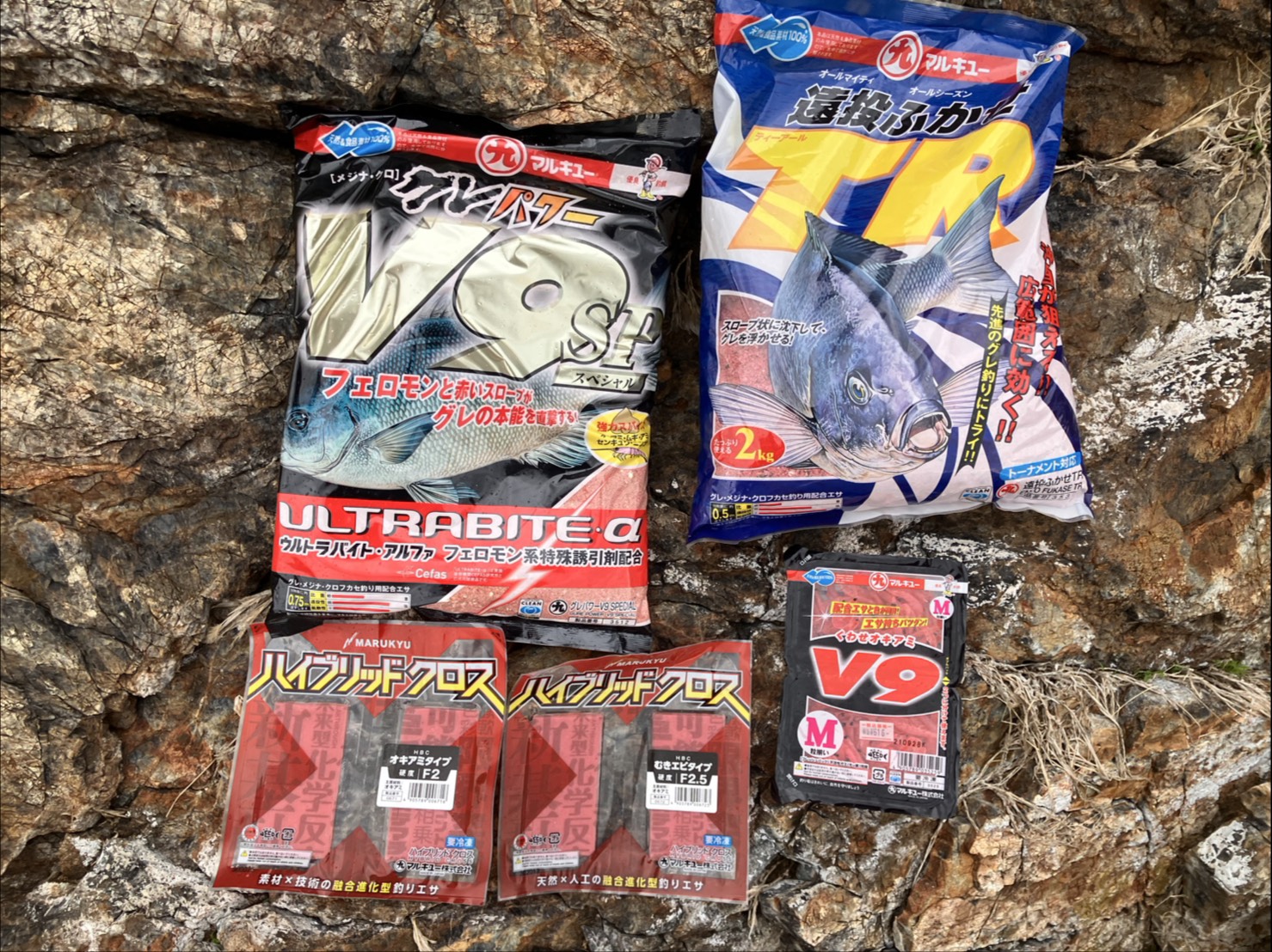 「グレパワーV9スペシャル」(2袋)+「遠投ふかせTR」(1袋)+オキアミ 6kg(2角)+海水