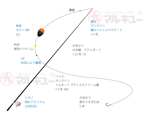 竿:がまかつ/がま磯 アテンダー3 1.25号-5.3m、リール:シマノ/BB-X テクニウム2500DXG、道糸:サンライン/磯スペシャルマスラード 1.5号、ハリス:サンライン/トルネードブラックストリーム極 1.5号、ウキ:釣研/ゼクトMR 0α、ハリ:がまかつ /掛かりすぎ口太 5号