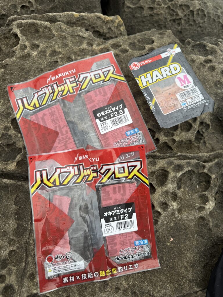付けエサは「くわせオキアミスーパーハード」のMサイズと「ハイブリッド クロス」のF2とF2.5を準備しました。