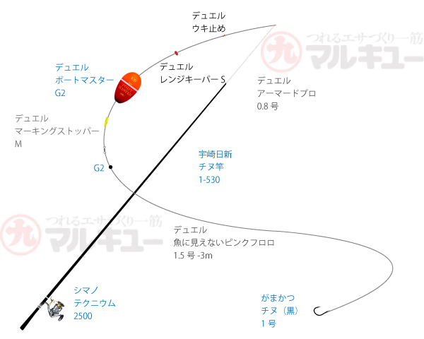 竿:宇崎日新/チヌ竿 1号-530、リール:シマノ/BB-X テクニウム2500、道糸:デュエル/アーマードプロ 0.8号、ハリス:デュエル/魚に見えないピンクフロロ 1.5号、ウキ:デュエル/ポートマスター G2、ハリ:がまかつ /チヌ(黒) 1号
