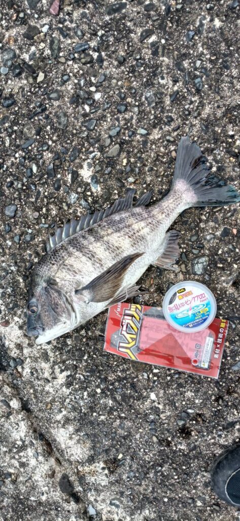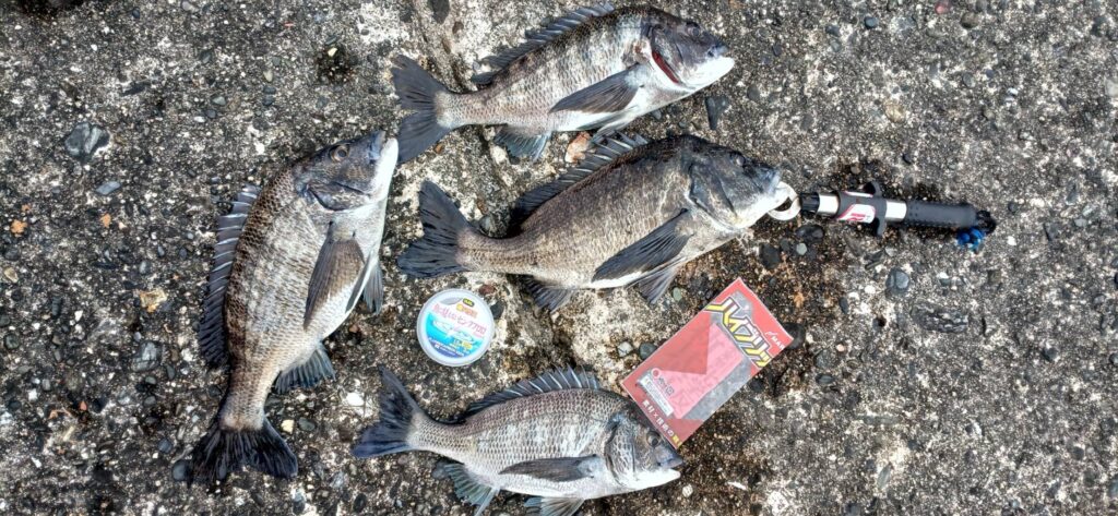 10分おきにアタリがあり、満潮までに45cmを頭に6枚のチヌを釣りました。
